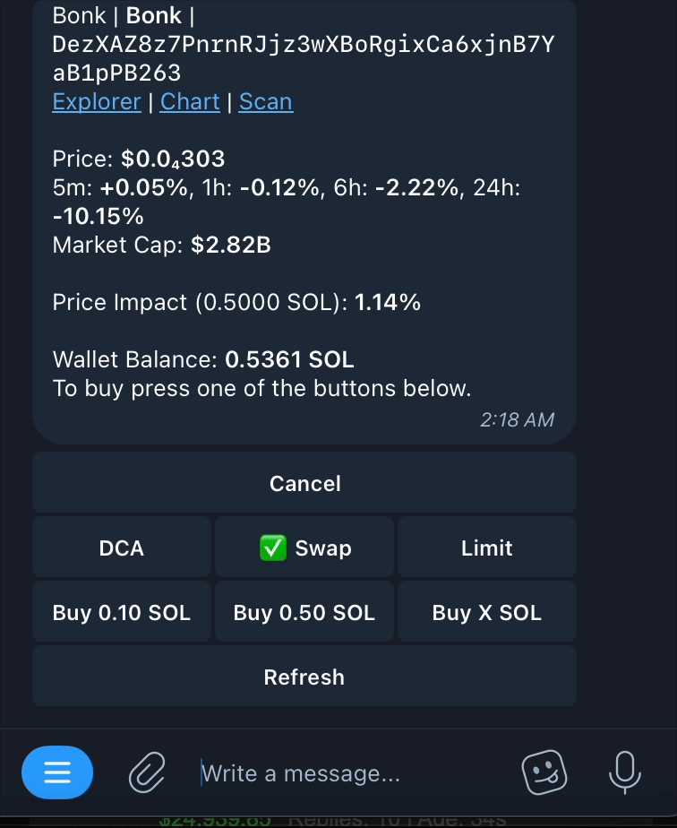 The **DCA** feature in BONKbot allows you to automate periodic buys or sells of tokens, like $BONK. This feature enables you to define intervals, transaction counts, and slippage settings, letting you dollar-cost average into new positions with precision.