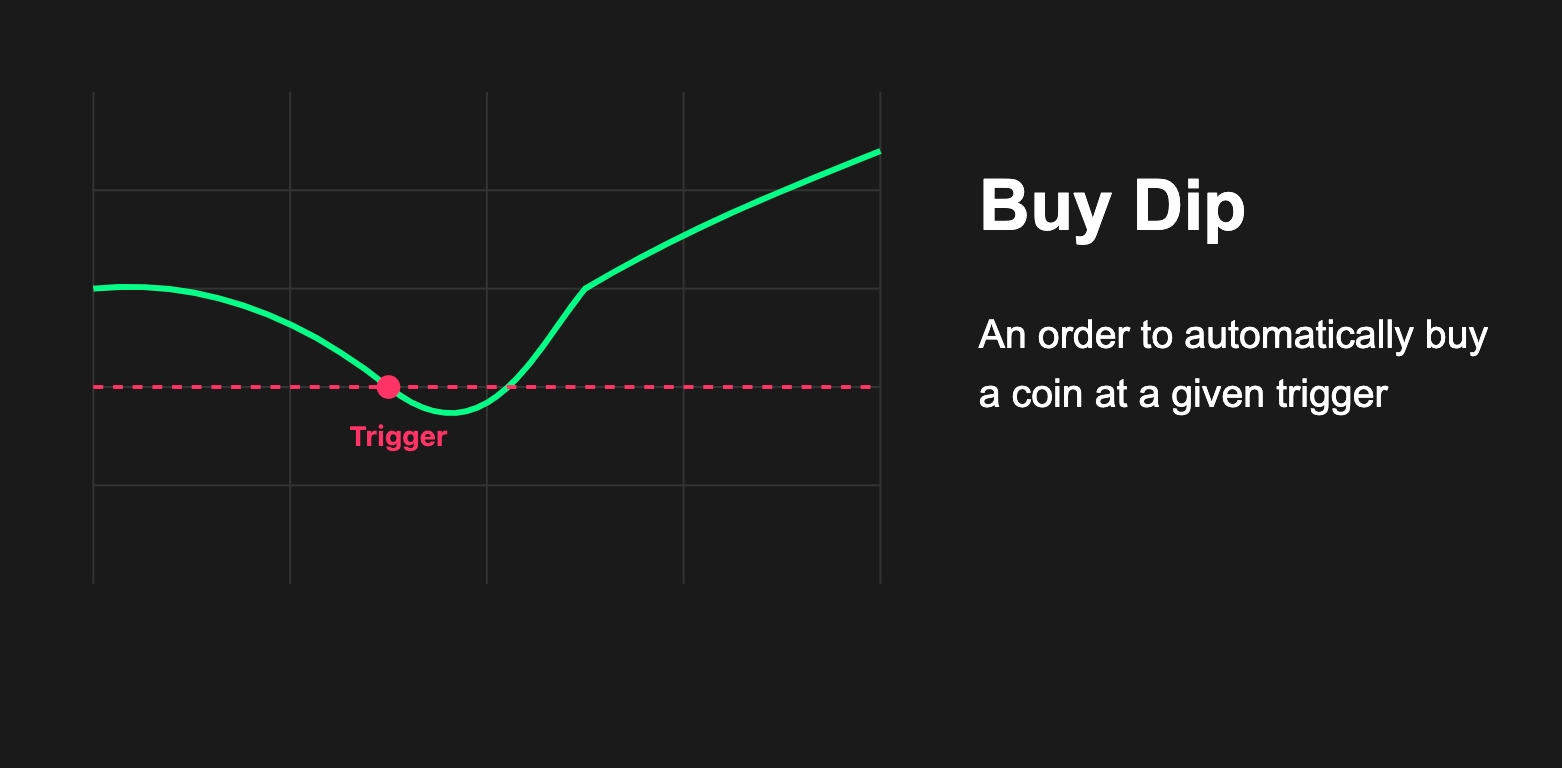 A Buy Dip Limit Order is set at a price below the current price. It executes to let you buy a coin when it goes down.