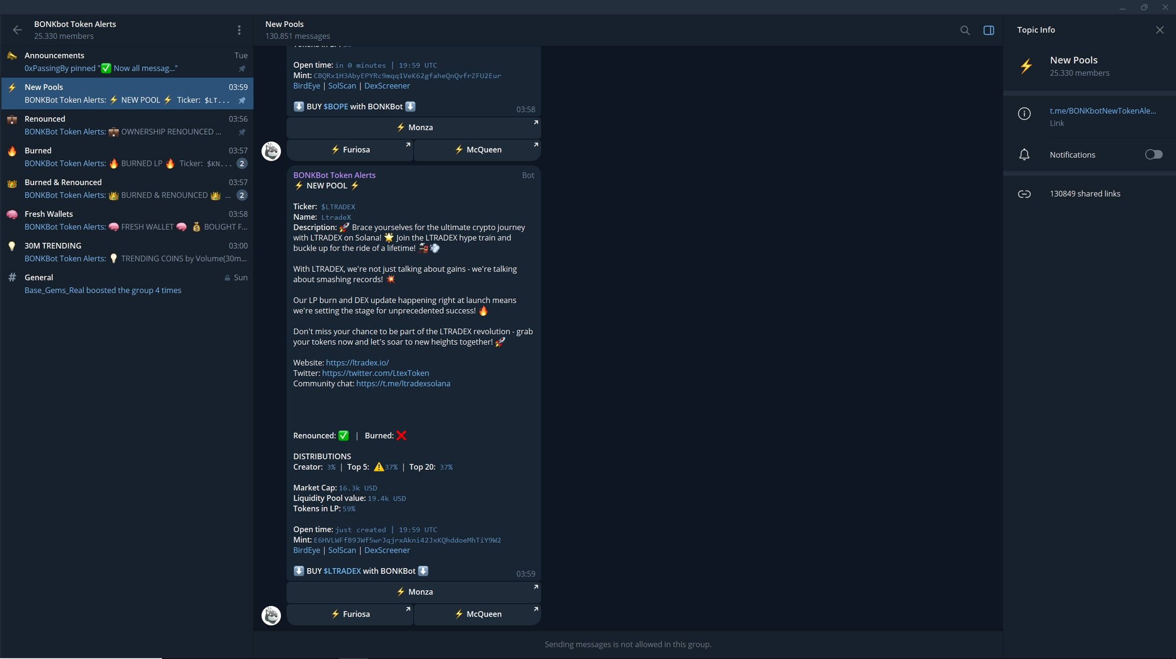 This section will list new tokens that have been created and have a liquidity pool of over 500$; the channel will monitor the chain and ping a message in this channel with new pairs meeting the criteria.