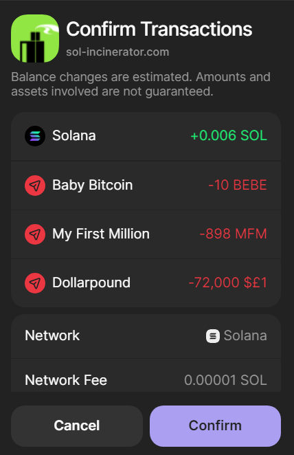 To burn tokens, simply connect your Solana wallet to the Sol Incinerator, scan for burnable assets, and select the tokens you wish to burn. As a result of the burn, you might be able to receive some SOL back in your wallet.&#x20;
