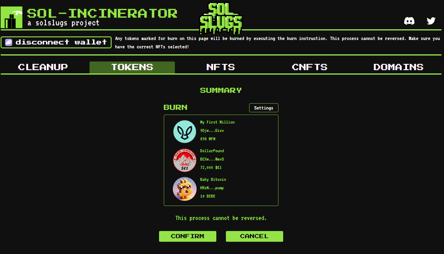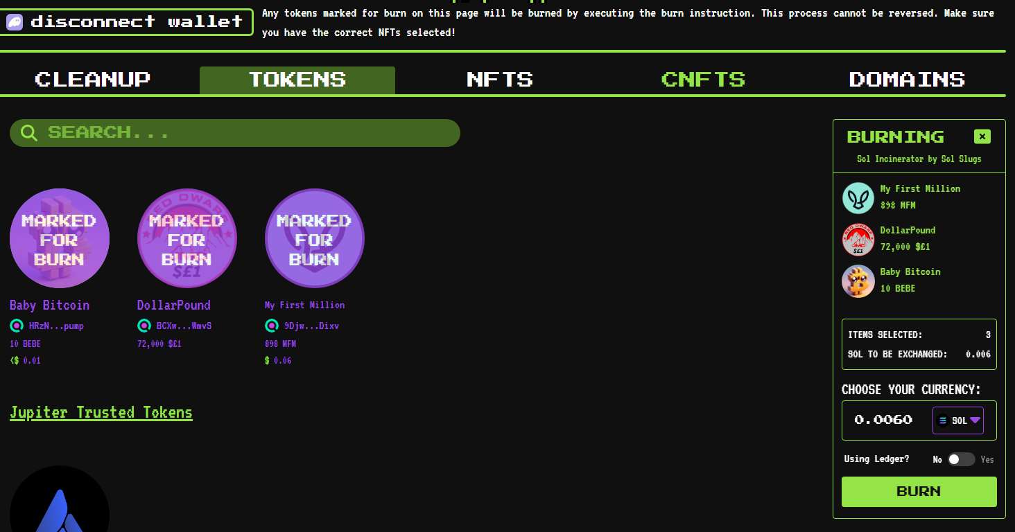 For those unfamiliar, **Sol Incinerator** was launched in 2021 by the team behind **Sol Slugs**, a deflationary NFT collection with a built-in token-burning mechanism. It is a **Solana-based decentralized application (dApp)** that allows users to burn unwanted tokens, NFTs, and even **Solana domain names (SNS)** to free up space in their wallet and potentially recover SOL.