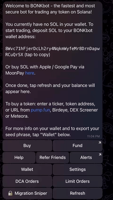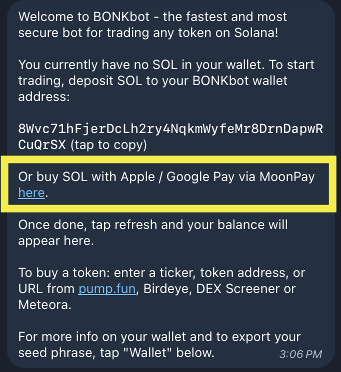 Need SOL to trade with? You can purchase SOL directly in BONKbot via MoonPay!