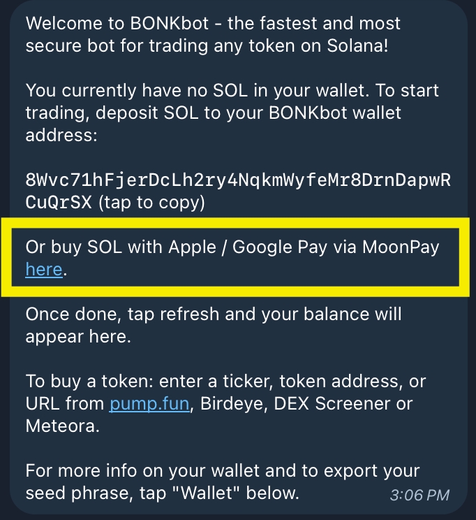 If you have 0 SOL in your wallet, you can access MoonPay directly from the BONKbot Home menu: