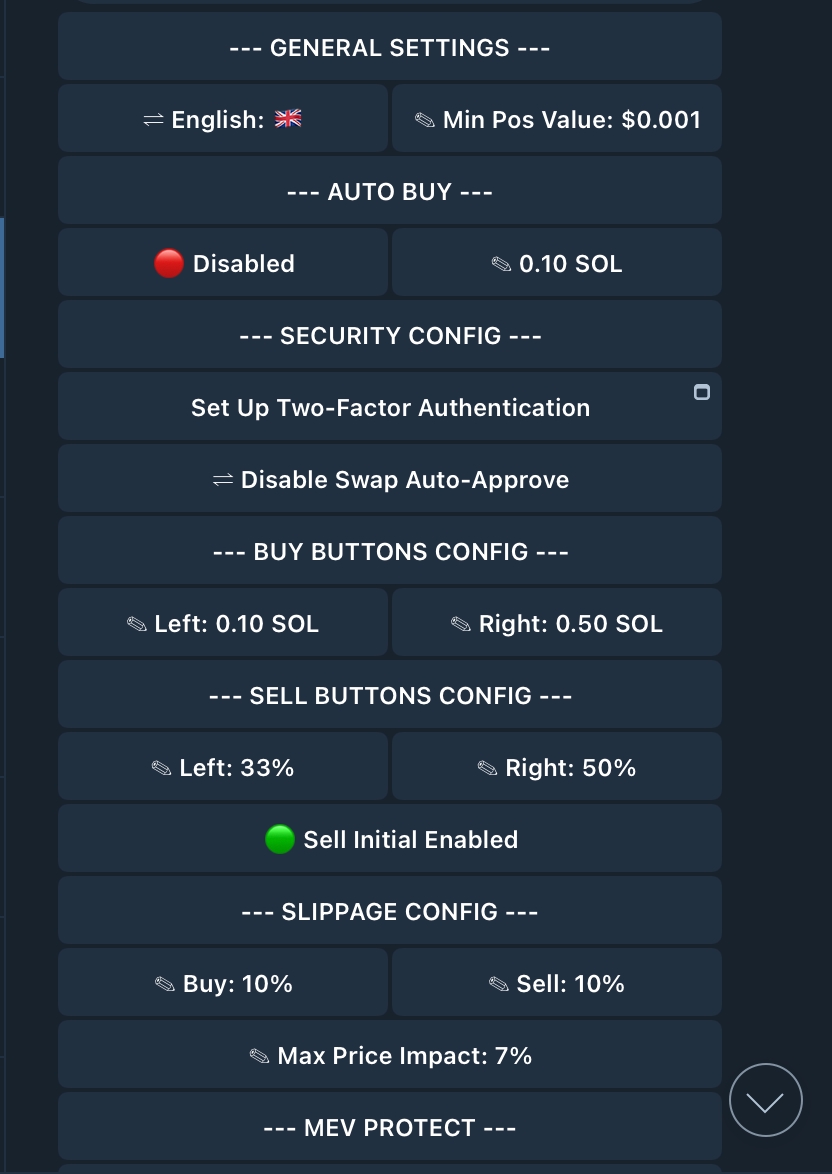Buy/Sell Buttons Config: Fine-tune the preset amounts and percentages for your buy and sell buttons, optimizing your dashboard for quick actions.
