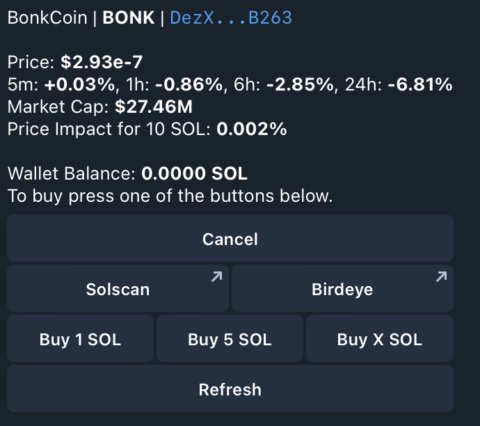 Reply with the token address, or name, and you can choose how much of the token you want to buy.