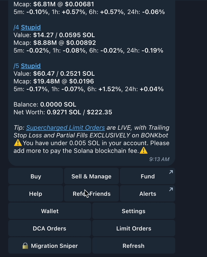 1. Open the **Sell & Manage** page from the BONKbot home menu