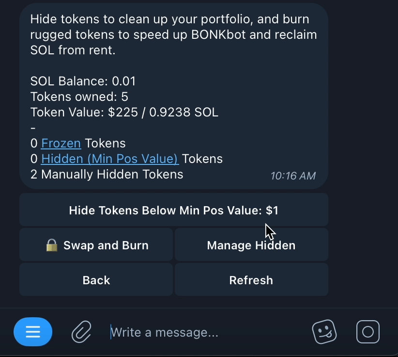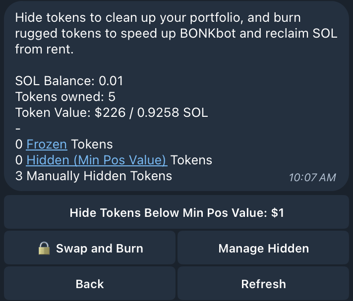 By default, BONKbot displays all token balances in your wallet. However, you have the option to manually hide tokens to reduce clutter in your wallet and/or remove suspicious airdrops.