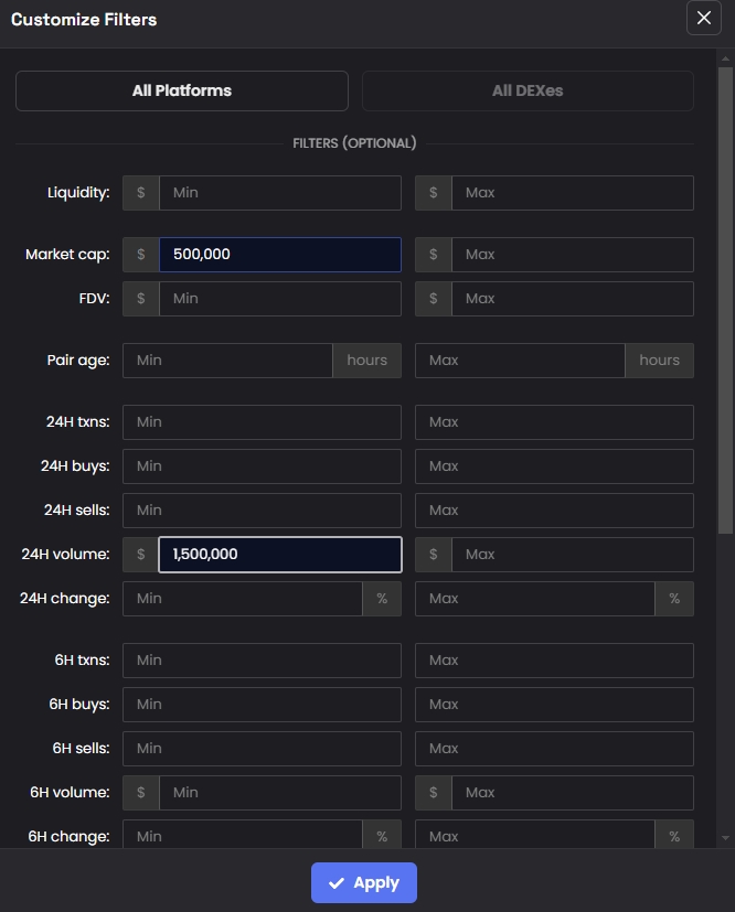 You may choose anything above $500k Market Cap, and at least 1.5m in 24h volume. This helps you filter for relevant coins, and you can then investigate the socials, and other key features.