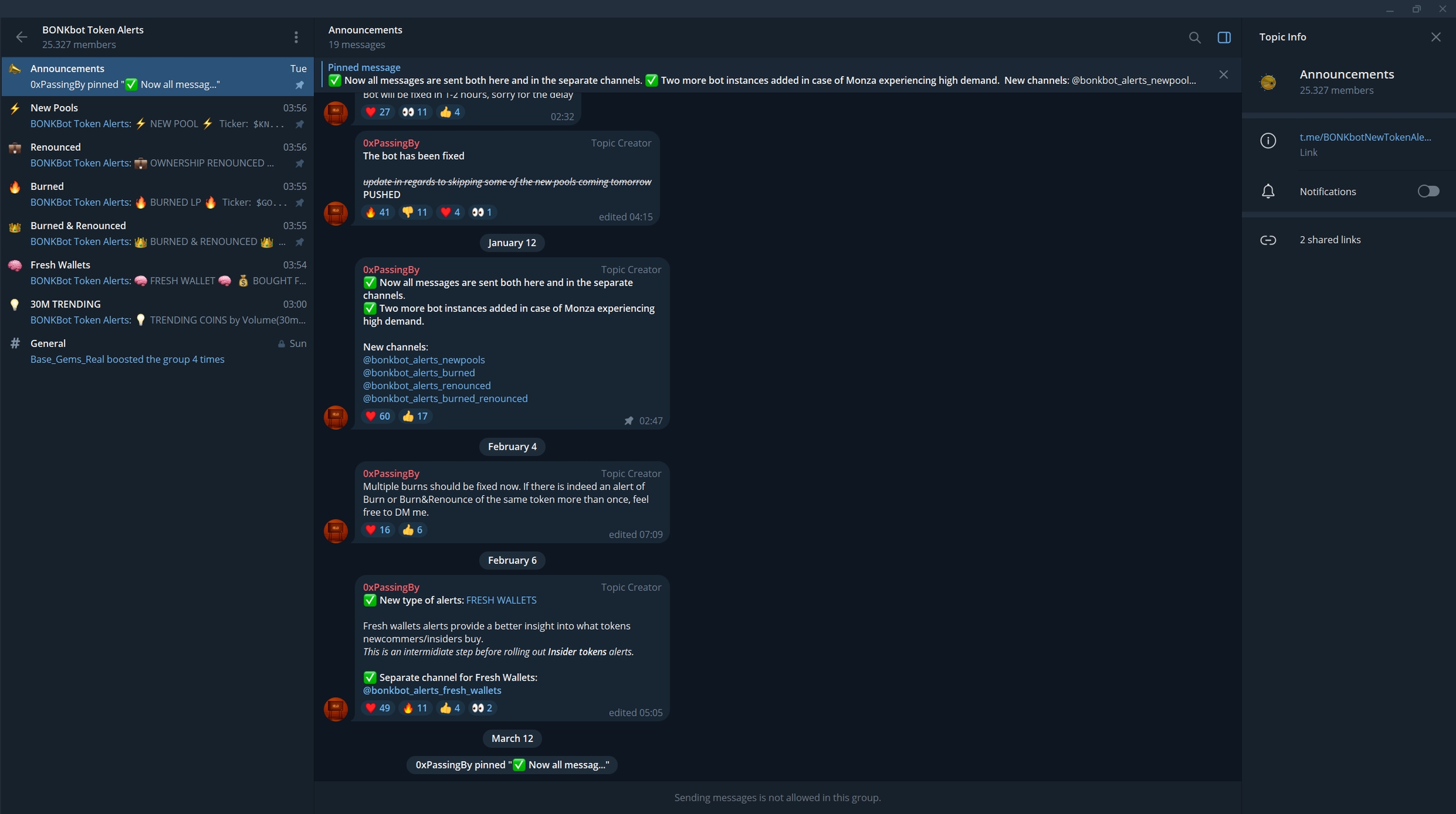 This section is for news regarding the BONKbot Token Alerts channel. The dev will post here information or news regarding the channel.