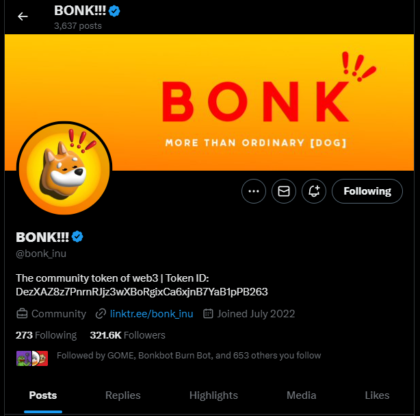 <figure><img src="https://content.gitbook.com/content/yubNuY870udVfgfPuvso/blobs/9a5VuKN9N5bQVz7OxnLR/image.png" alt=""><figcaption><p>Example: The highly successful Twitter account of the $BONK token.</p></figcaption></figure>